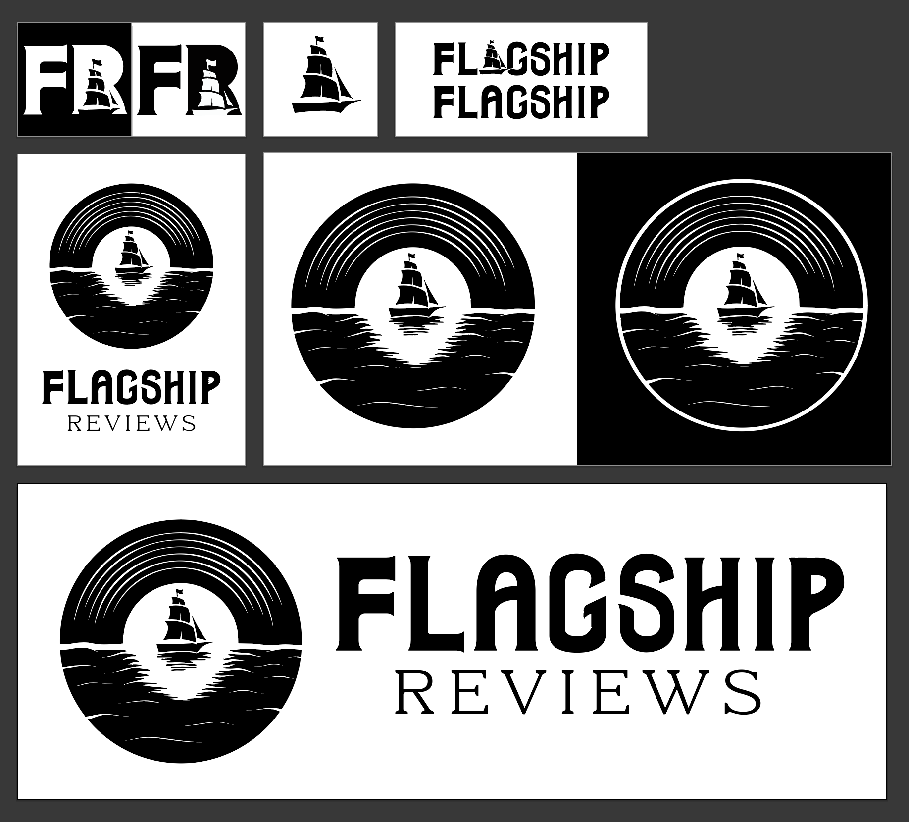 I experimented with how a flagship might interact with a vinyl for a circular badge or combined logo, and went through multiple iterations trying to get the wake/reflections right before choosing to simplify the idea.